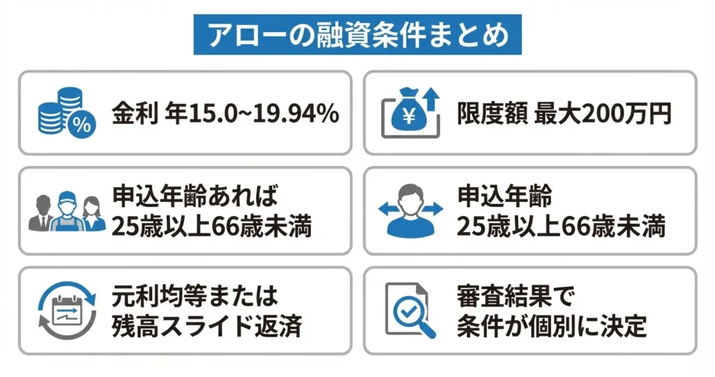 アローの利用を検討する際には、金利・限度額・返済方法といった融資条件を正確に把握することが重要です。