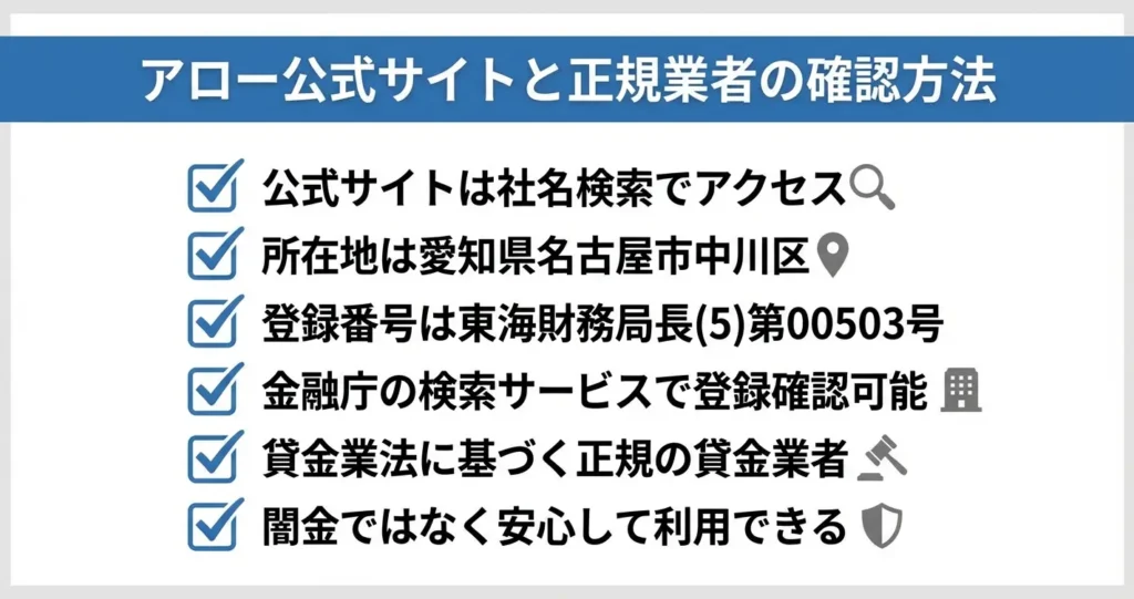 アローを利用する前に、まず確認すべきは公式サイトの正確なアクセス方法と、運営会社が正規の貸金業者であるかどうかです。
