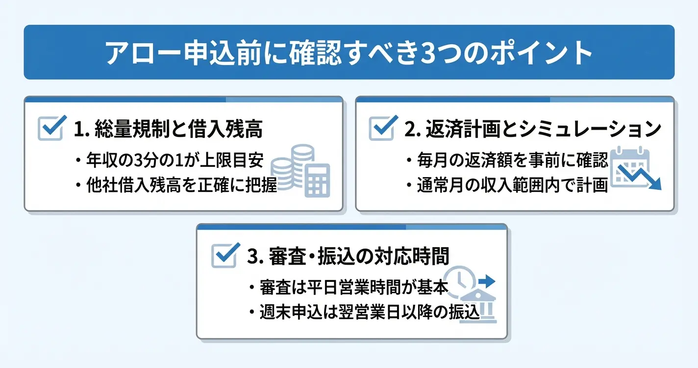 アローへの申し込みを検討する際は、法律上の借入制限や返済の実現性、対応可能な曜日などを事前に確認しておく必要があります。