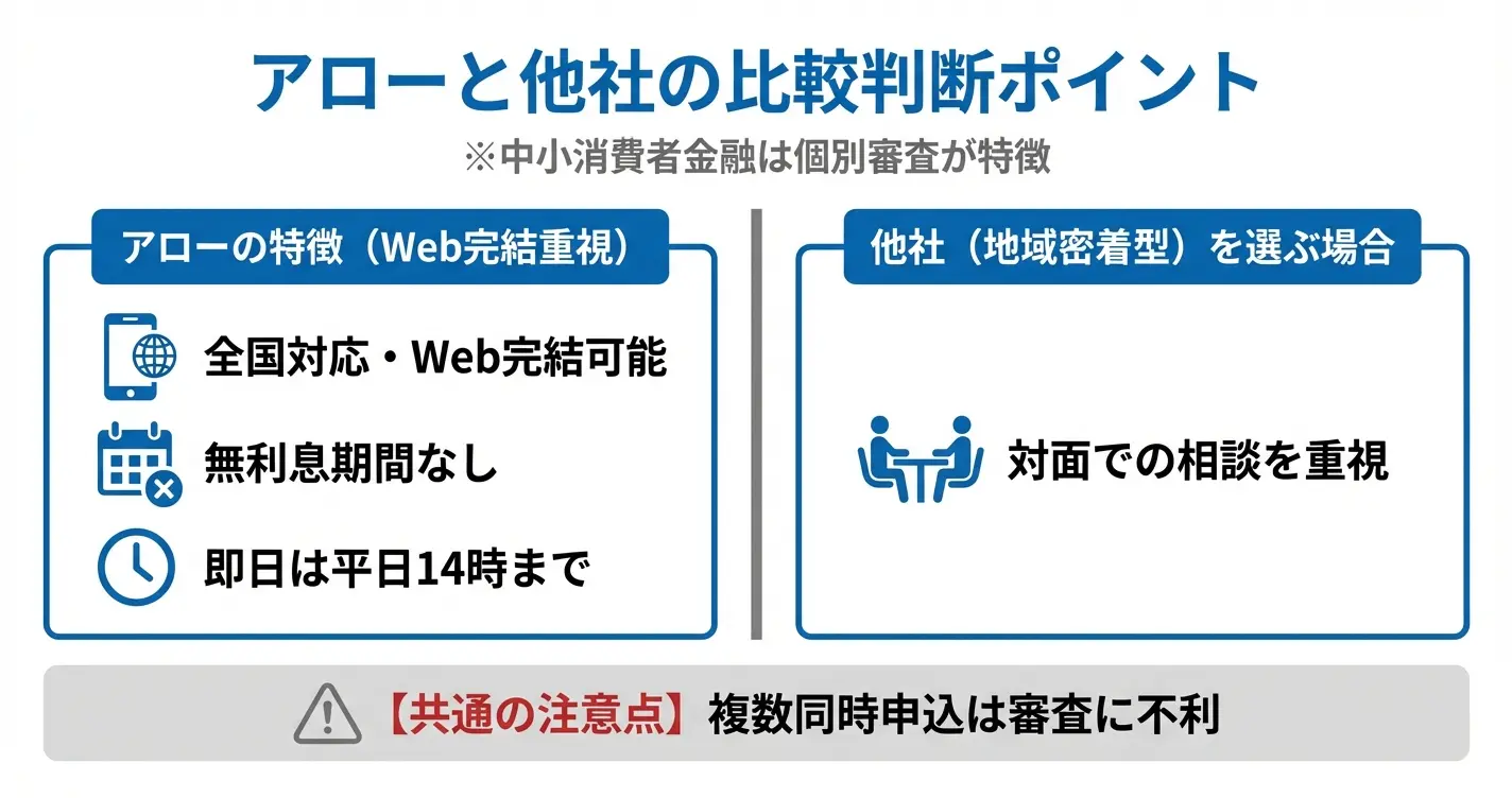 アローもこの中小消費者金融に分類され、愛知県を拠点に全国対応を行っている点で、来店対応を前提とする地域密着型の業者とは異なる運営形態をとっています。