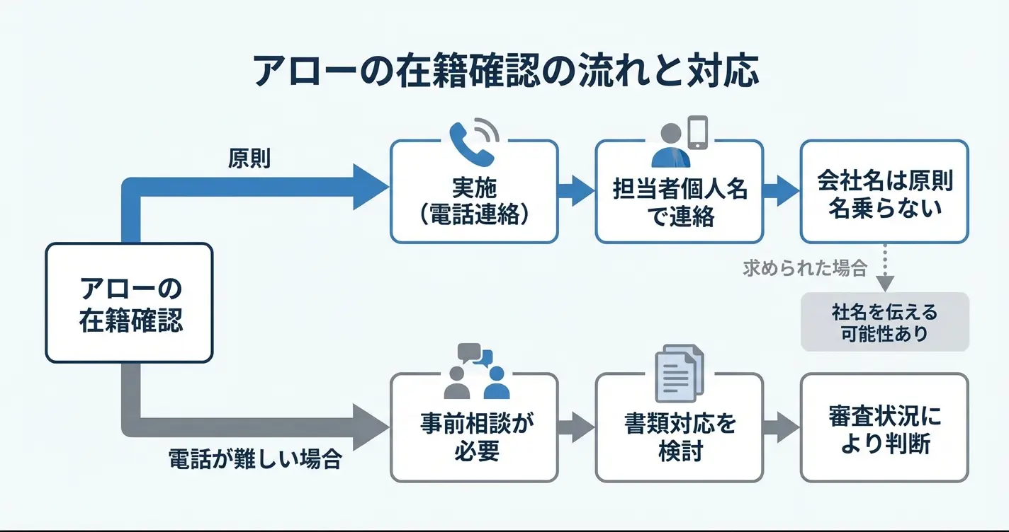 アローでは、在籍確認のための職場への電話連絡が原則として実施されます。