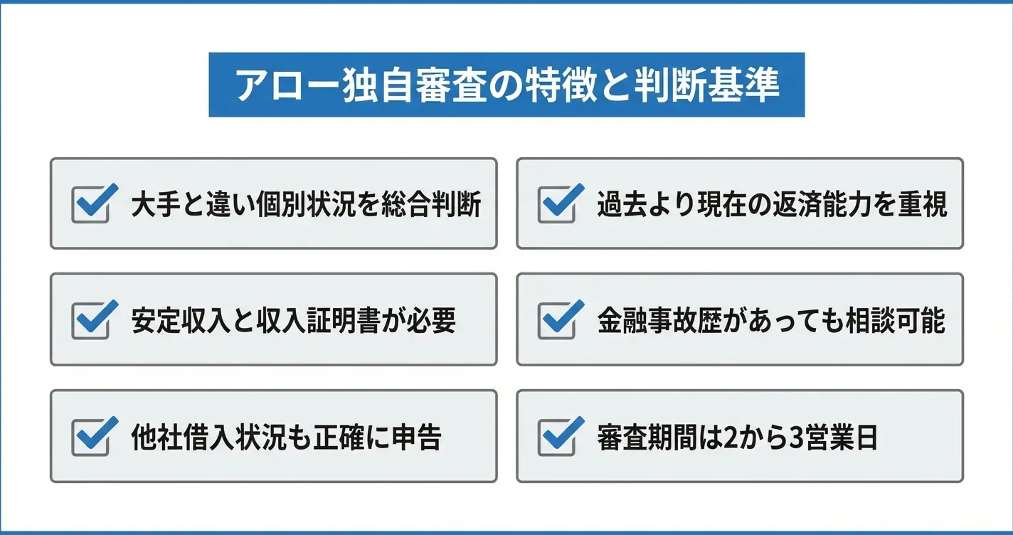 アローは信用情報機関のスコアだけに頼らず、現在の状況を重視した独自基準で審査を行っています