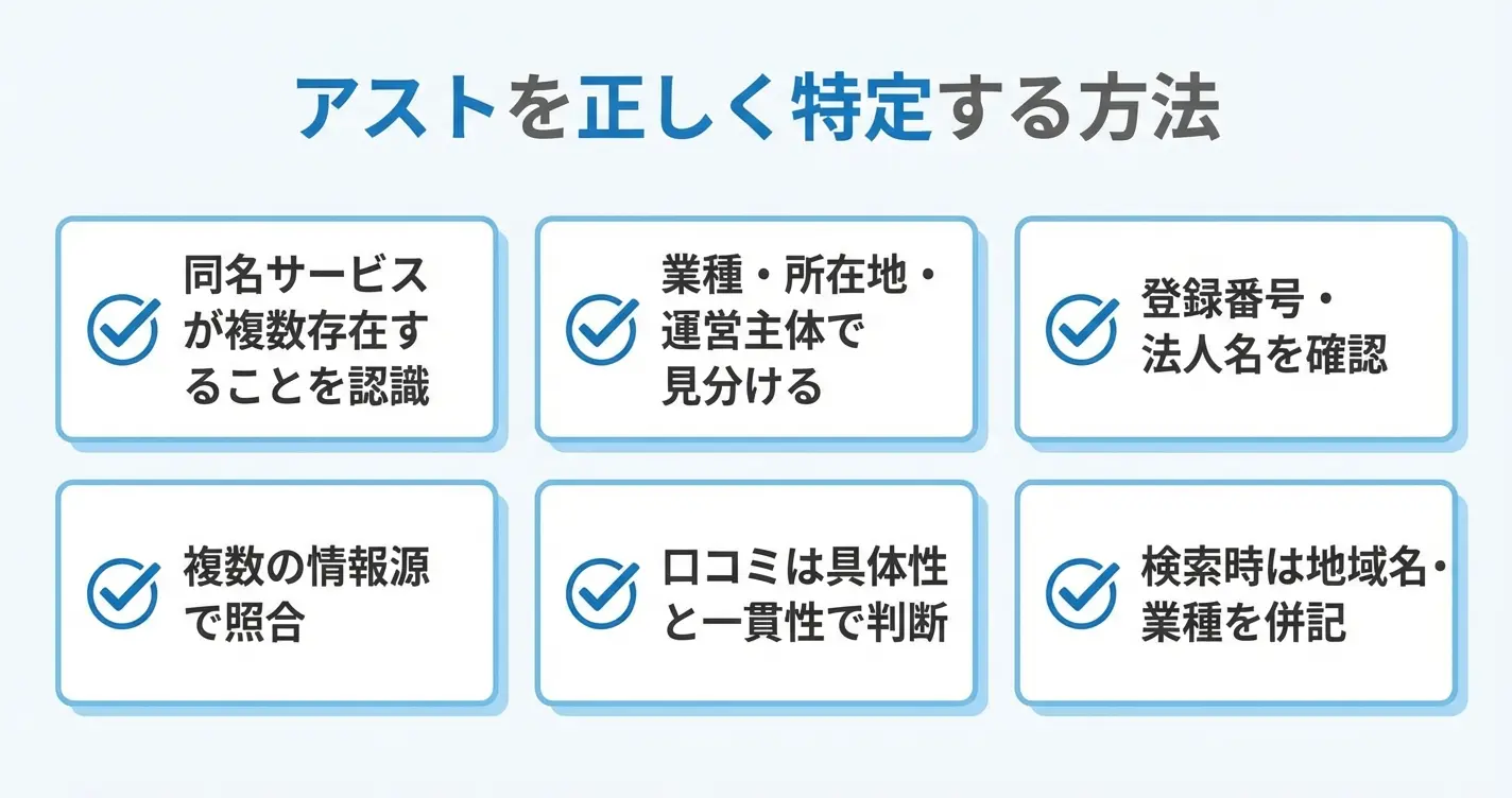 アストという名称は複数のサービスや施設で使用されているため、サービス内容・所在地・運営主体の3点を確認することが重要です