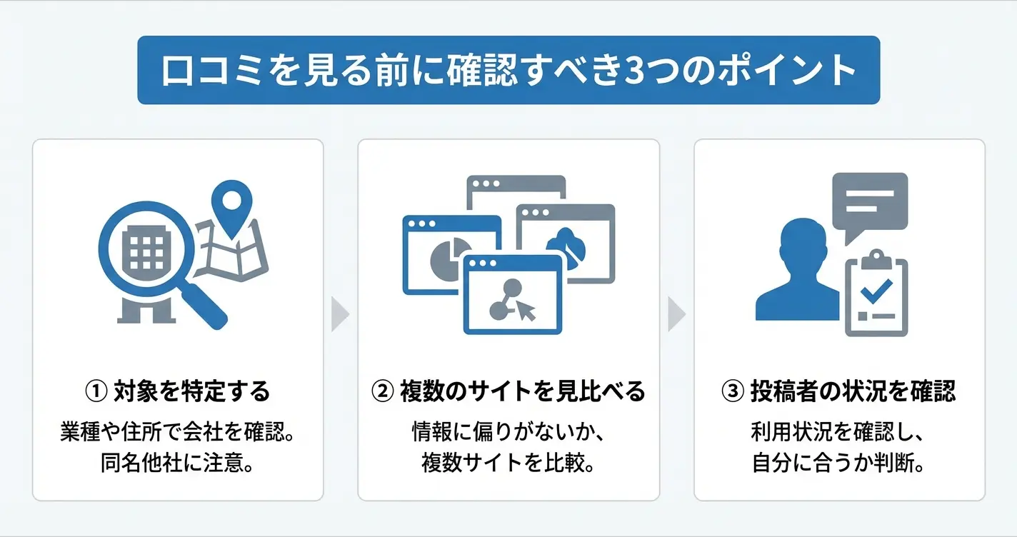 最低でも2〜3つの異なる口コミサイトを見比べることで、偏りの少ない判断ができます