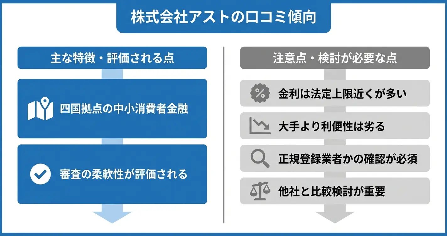 株式会社アストは四国財務局登録の中小消費者金融で、審査の柔軟性と金利負担のバランスが評価の分かれ目となっています