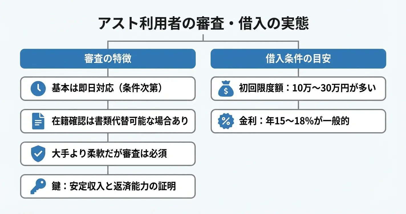 アストの審査は大手より柔軟な傾向があるものの、「誰でも借りられる」わけではなく、安定収入と返済能力の証明が審査通過の分かれ目となります。