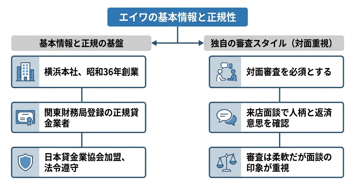 このセクションでは、エイワの会社概要と正規の貸金業者としての位置づけ、そして他の消費者金融とは異なる独自の融資スタイルについて整理します。