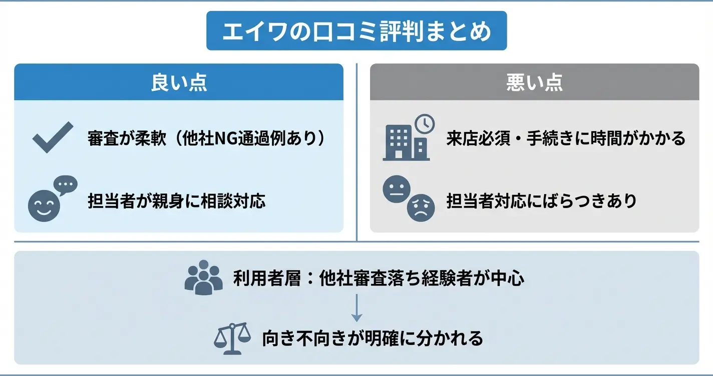 エイワの口コミでは「大手で断られたが借りられた」という評価がある一方、「店舗まで行く時間がない」「Web完結できないのが不便」といった声もあるため、利便性と審査の柔軟性のどちらを優先するかが判断の基準になります。