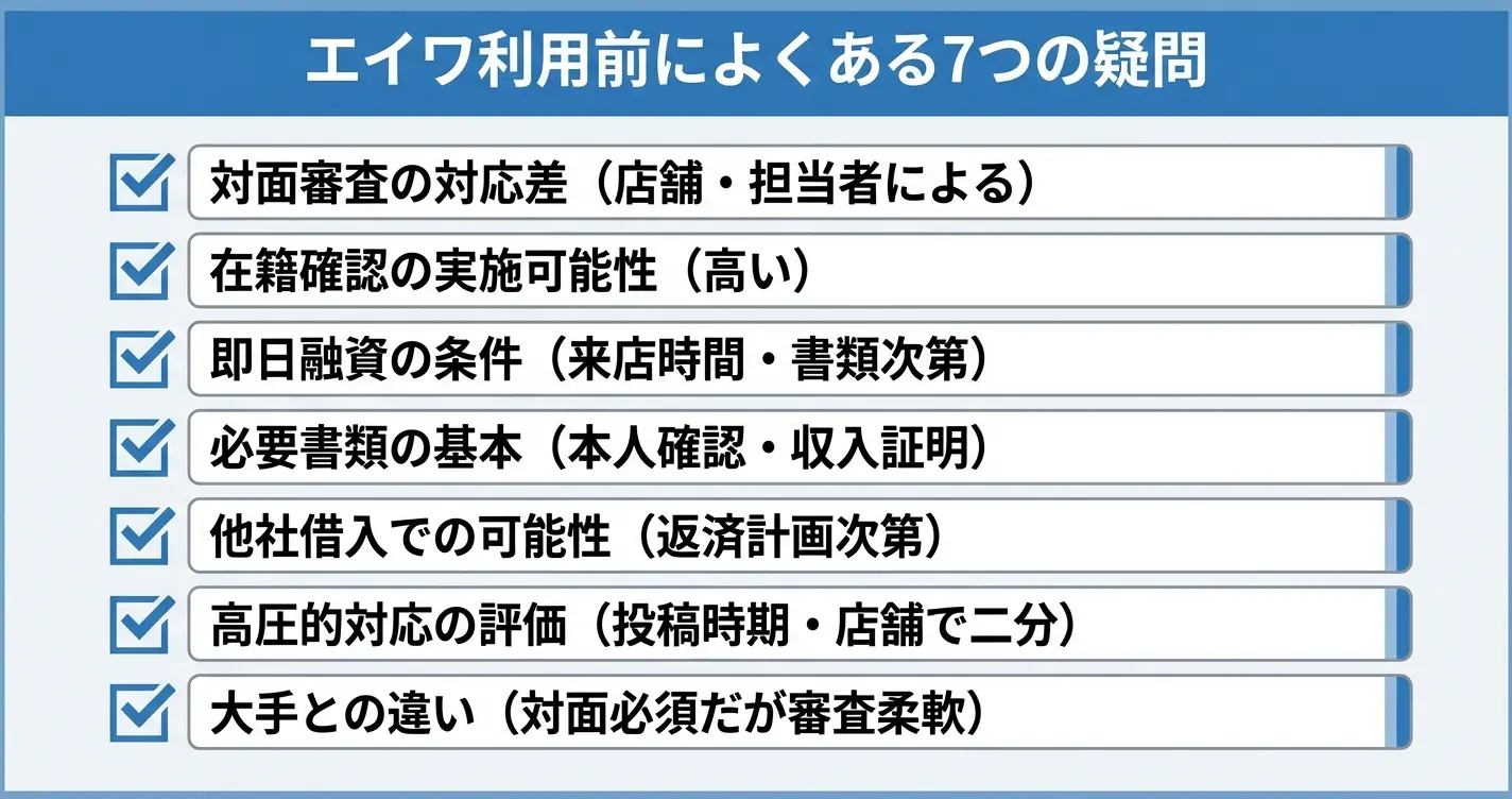 エイワの利用を検討する際、審査の難易度や融資条件、在籍確認の方法など、気になる点は多いものです。