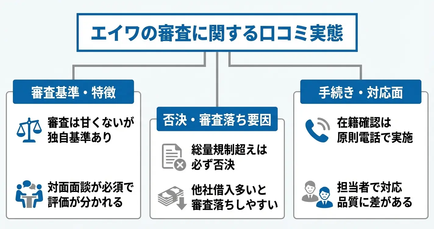 このセクションでは、実際の利用者による審査体験の口コミをもとに、審査基準の実態、対面面談の流れ、審査落ちのパターン、在籍確認の方法について整理します。
