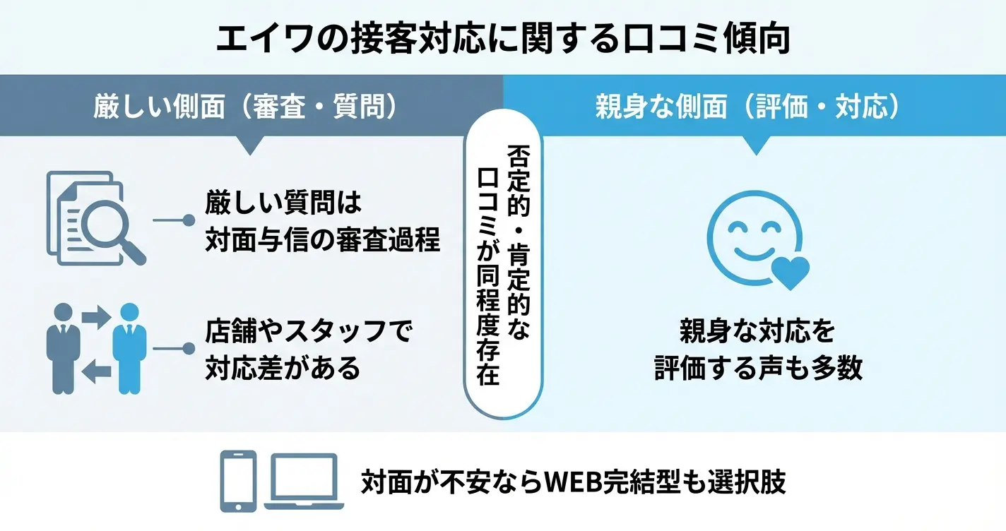 エイワの口コミでは「店舗での面談が丁寧だった」という評価がある一方で、「説教のような話が長い」「来店のハードルが高い」といった声も見られます。