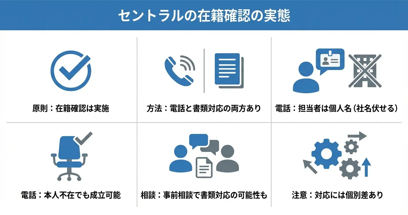 セントラルは原則として在籍確認を行うが、事前相談により書類提出での代替が認められるケースもある