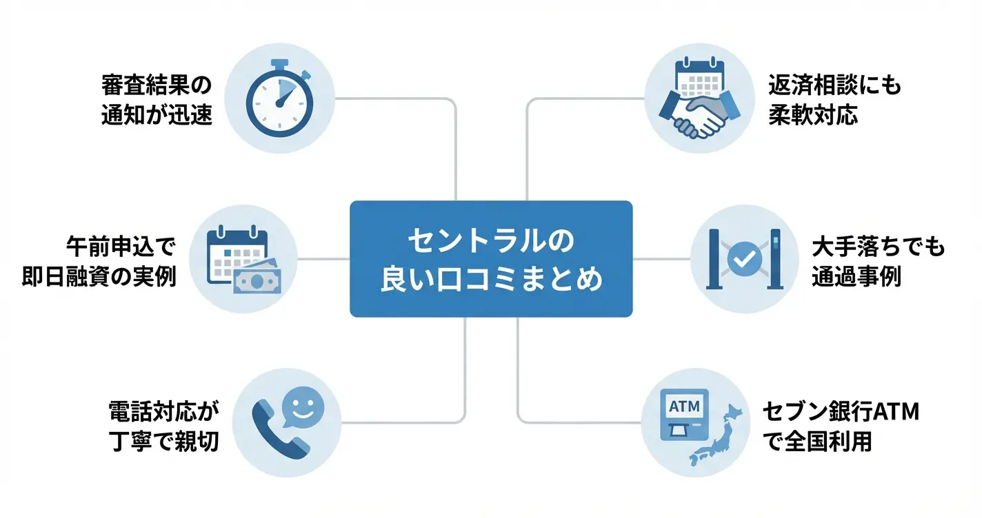肯定的な書き込みとしては、審査スピードの速さや対応の丁寧さを評価する内容が挙げられます。特に、他社で断られた後にセントラルの審査に通過したという報告や、在籍確認の方法について柔軟に対応してもらえたという声が見られます。