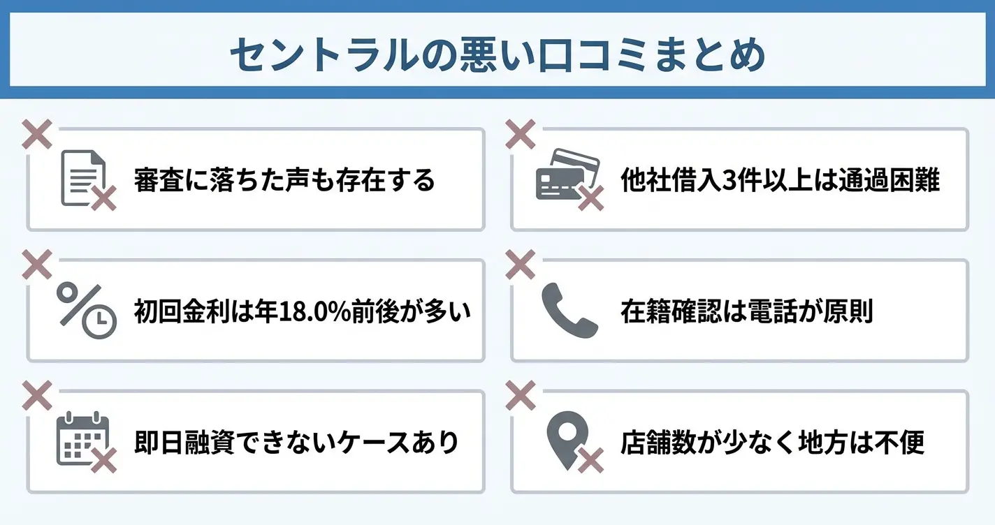 ここでは、セントラルに関する悪い口コミや評判を整理し、利用前に把握しておくべきリスクや注意点を明確にします。公式情報だけでは分かりにくい実際の利用者の不満を知ることで、自分にとって許容できる範囲かどうかを冷静に判断する材料として活用できます。