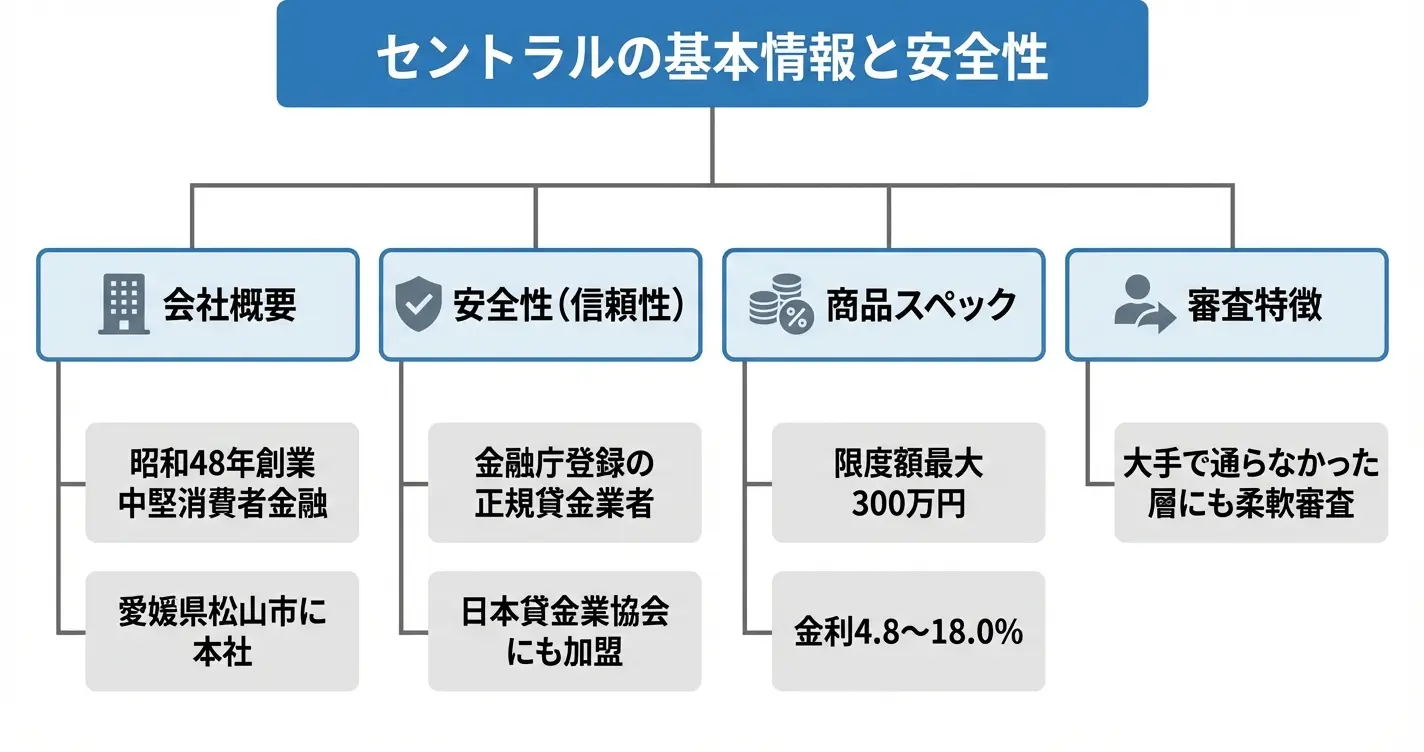 このセクションでは、セントラルの運営会社情報、正規の貸金業者であることの確認方法、そして提供しているサービスの概要について整理します。