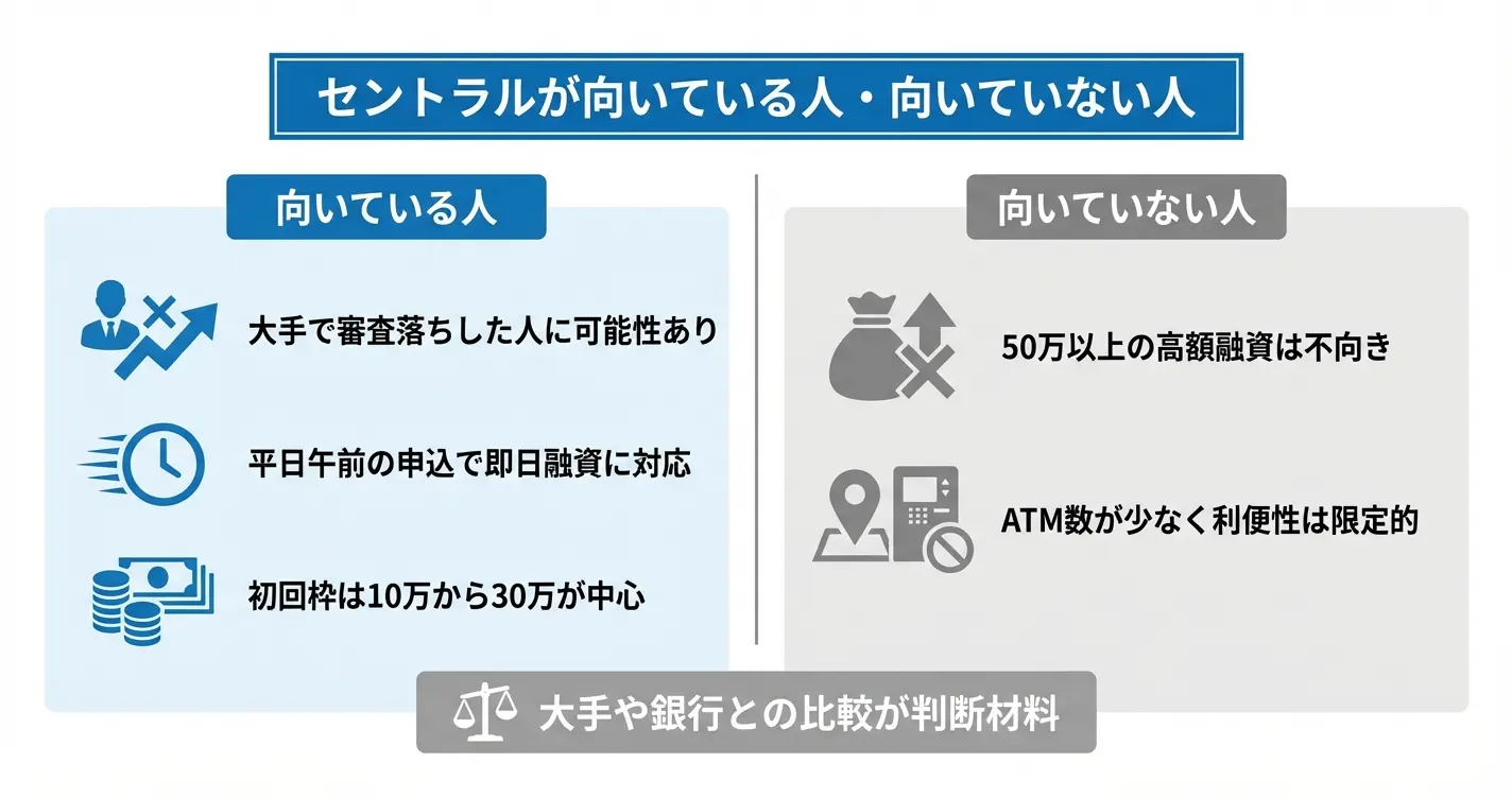 セントラルは独自の審査基準を持つため、大手で断られた人や柔軟な対応を求める人に適しています
