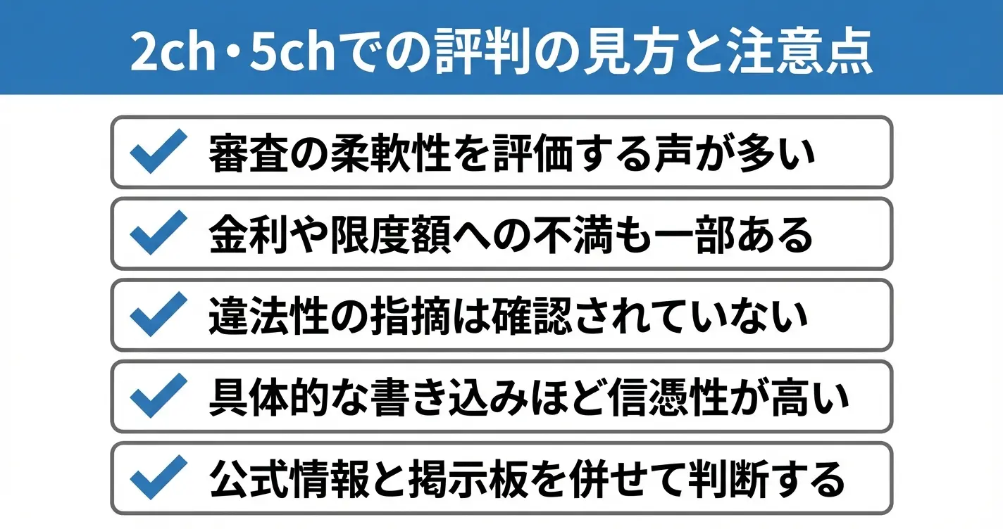 全体的な評価の傾向としては、審査の柔軟性を評価する声が比較的多い状況です。否定的な意見は主に金利水準や限度額に関するものが中心で、違法性を指摘する書き込みは確認されていません。