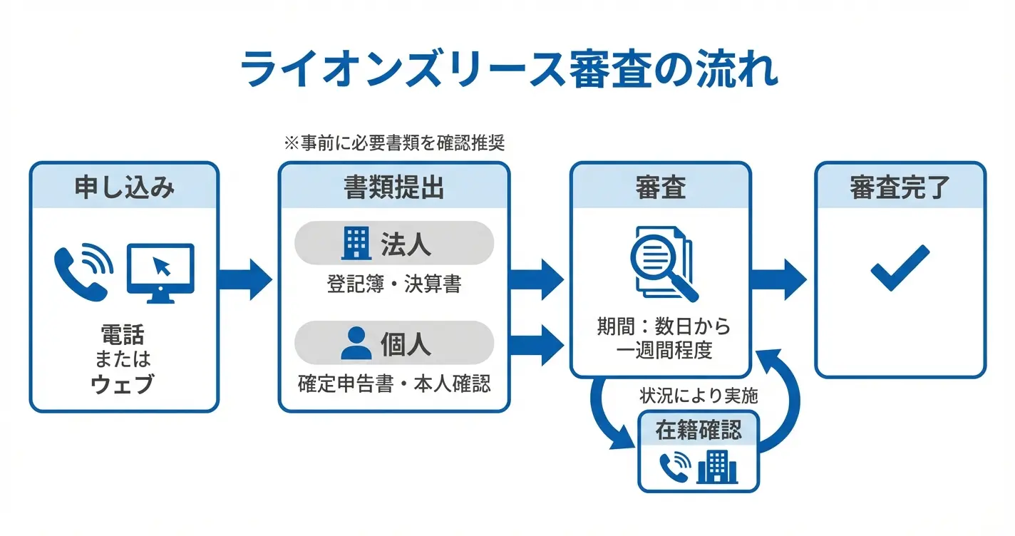 ライオンズリースにおける審査は、申し込み受付後に書類確認と与信審査が行われ、承認後に契約手続きへ進む構成が一般的です。