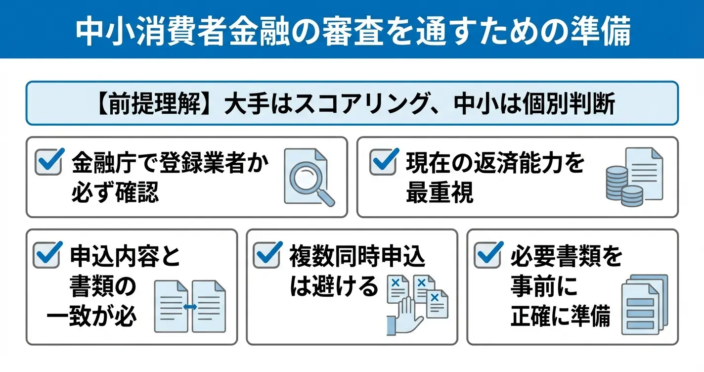 中小業者は独自審査とはいえ信用情報は必ず照会するため、申込は1〜2社に絞り、審査結果を確認してから次を検討する慎重な姿勢が望ましいです。