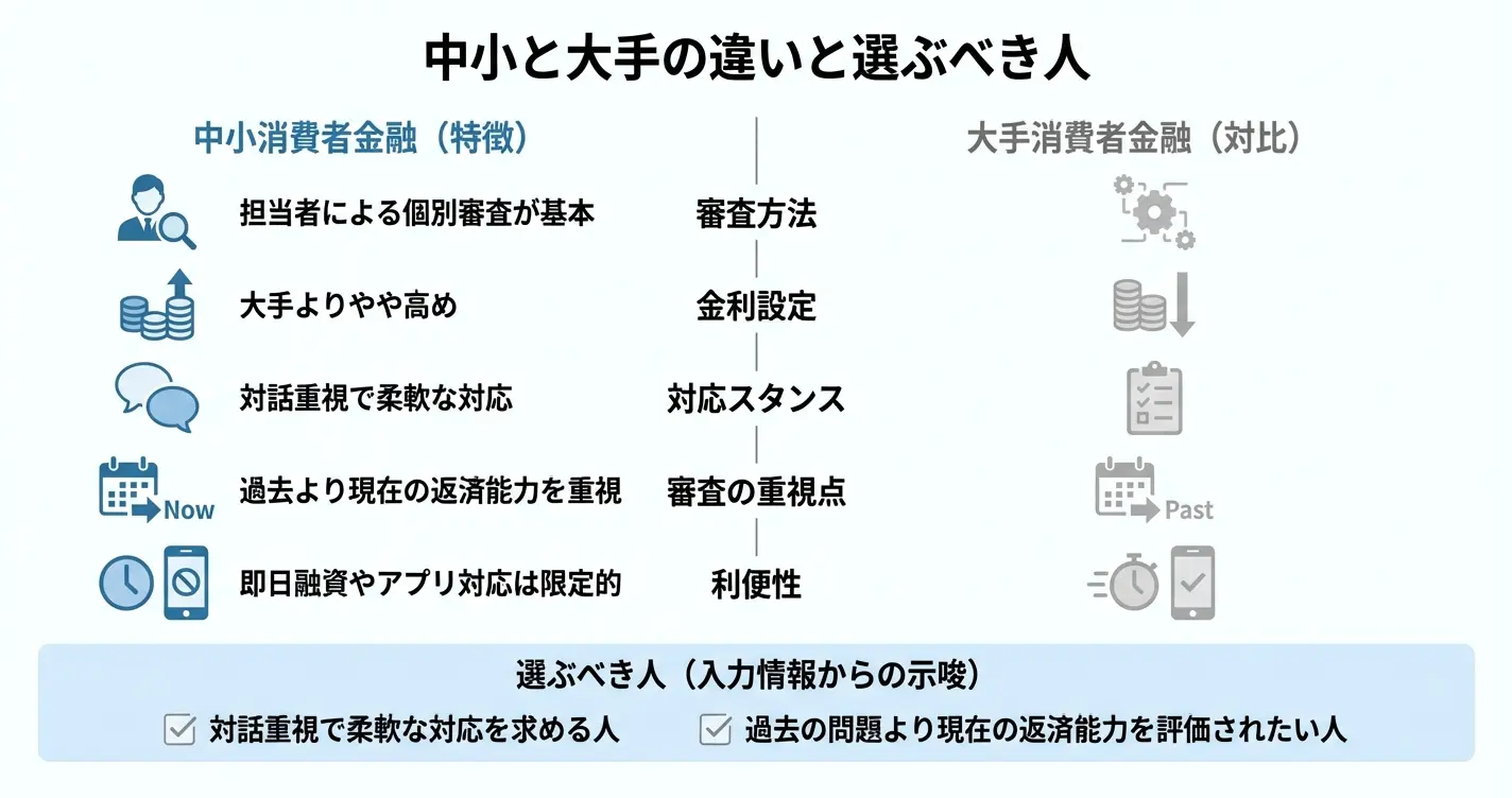 ここでは中小消費者金融の基本的な定義と、大手との具体的な違い、そしてどのような人に向いているのかを解説します。