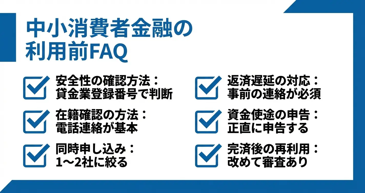 中小消費者金融は、大手とは異なる独自の対応をする業者が多いため、疑問点は申込前に直接確認することが最も確実です。