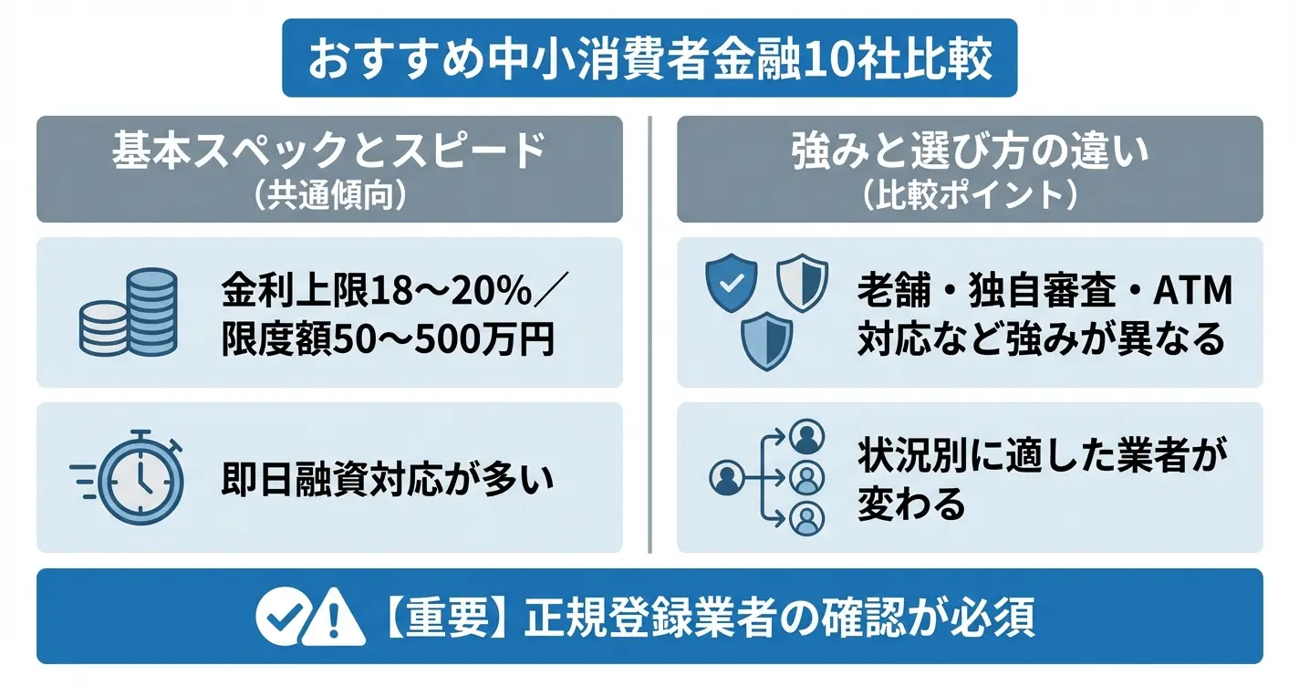 この記事では、金融庁登録済みの安全な中小消費者金融10社を比較し、審査基準・融資スピード・必要書類の違いを整理しているので、あなたに合った2〜3社を絞り込んで申込判断ができるようになります。