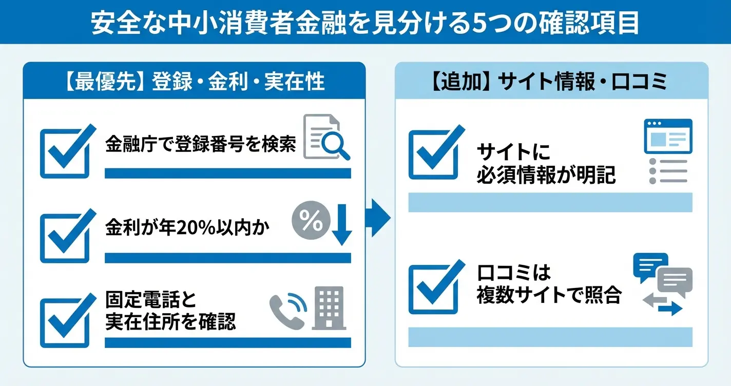 最優先で確認すべきは「登録番号の確認」「金利が法定範囲内か」「会社の実在性」の3点です