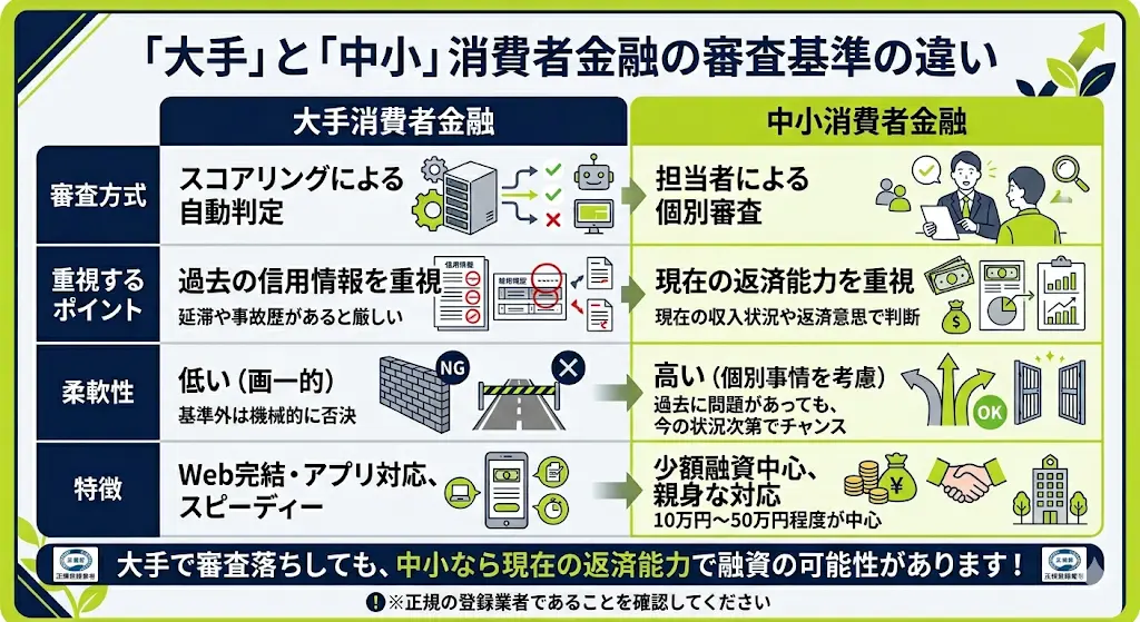 一方、中小消費者金融は担当者が申込内容や事情を個別に確認し、過去の信用事故があっても現在の返済能力を重視して判断する傾向があります。
