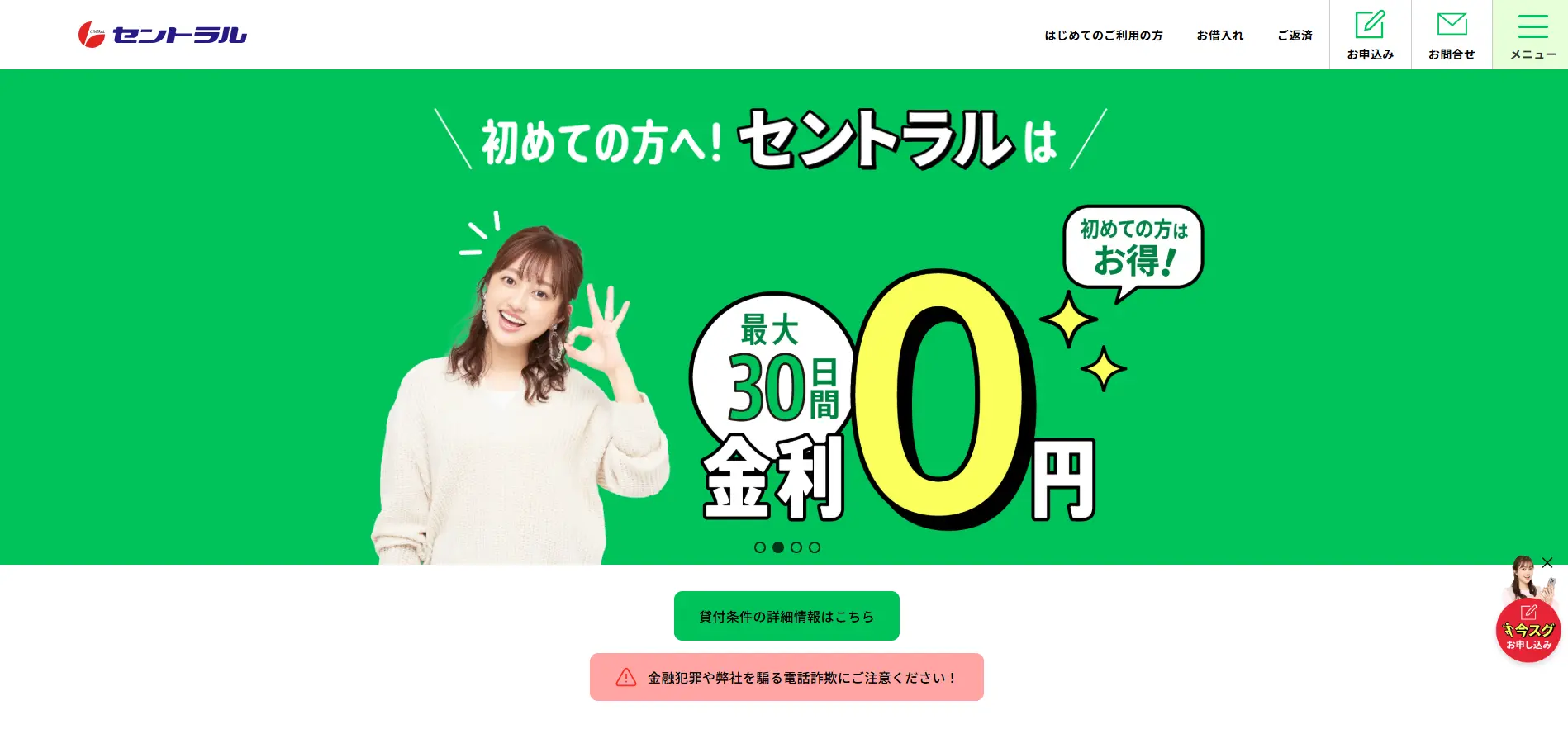 セントラル最大の特徴は、初めての方なら契約日の翌日から30日間金利がかからないこと。
