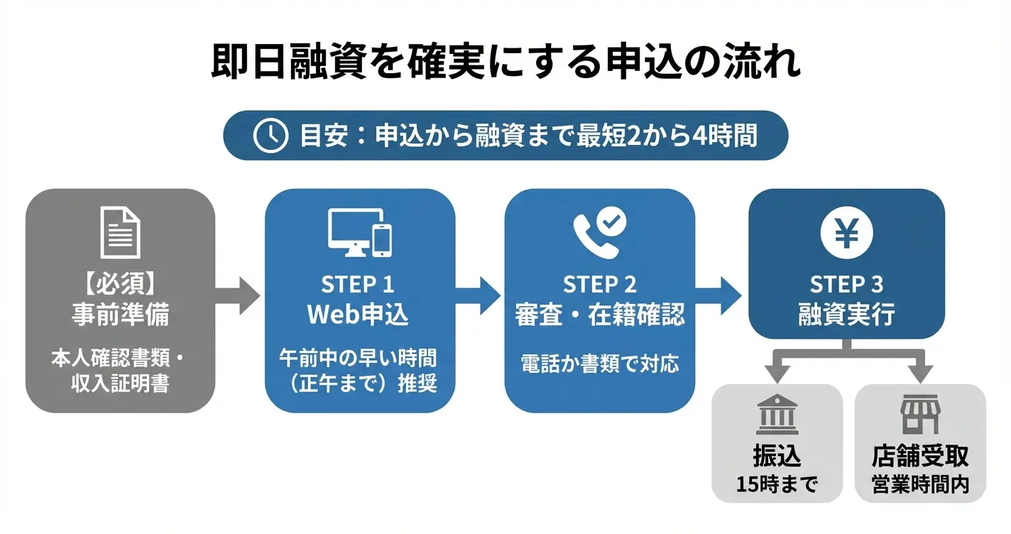 書類に不備があった場合や、在籍確認が取れない場合は当日融資が難しくなるため、必要書類を事前に準備し、勤務先への連絡がつきやすい時間帯に申し込むことが重要です。