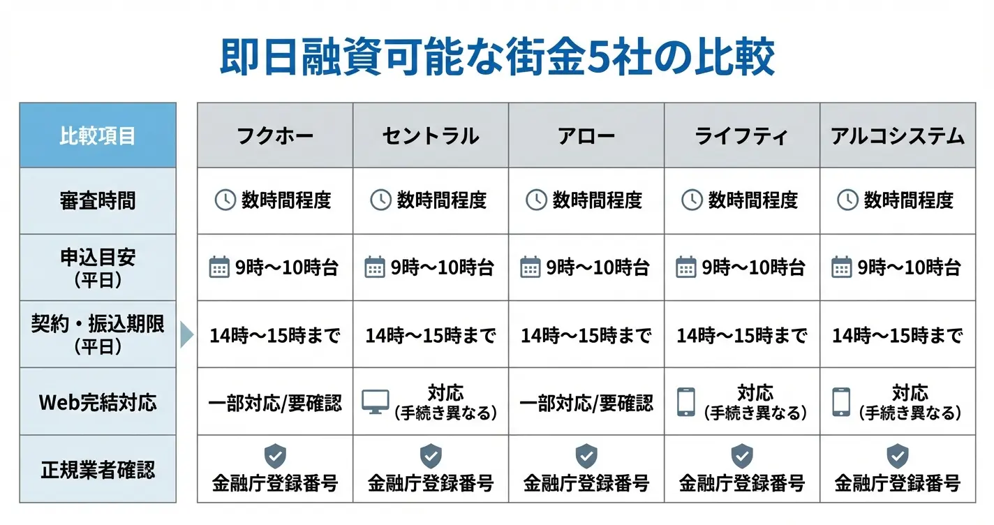 ここでは即日融資の実績がある主要な街金5社について、審査時間・融資対応時間・Web完結の可否などの観点から比較します。安全に利用できる正規の貸金業者のみを取り上げ、各社の特徴を整理していきます。