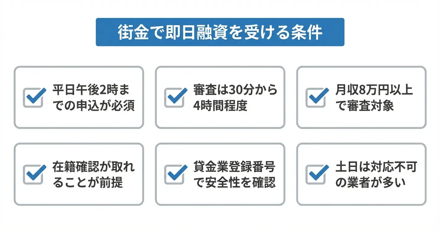 このセクションでは、街金で即日融資を受けるための具体的な条件と、大手との違いを含めた仕組みを解説します。