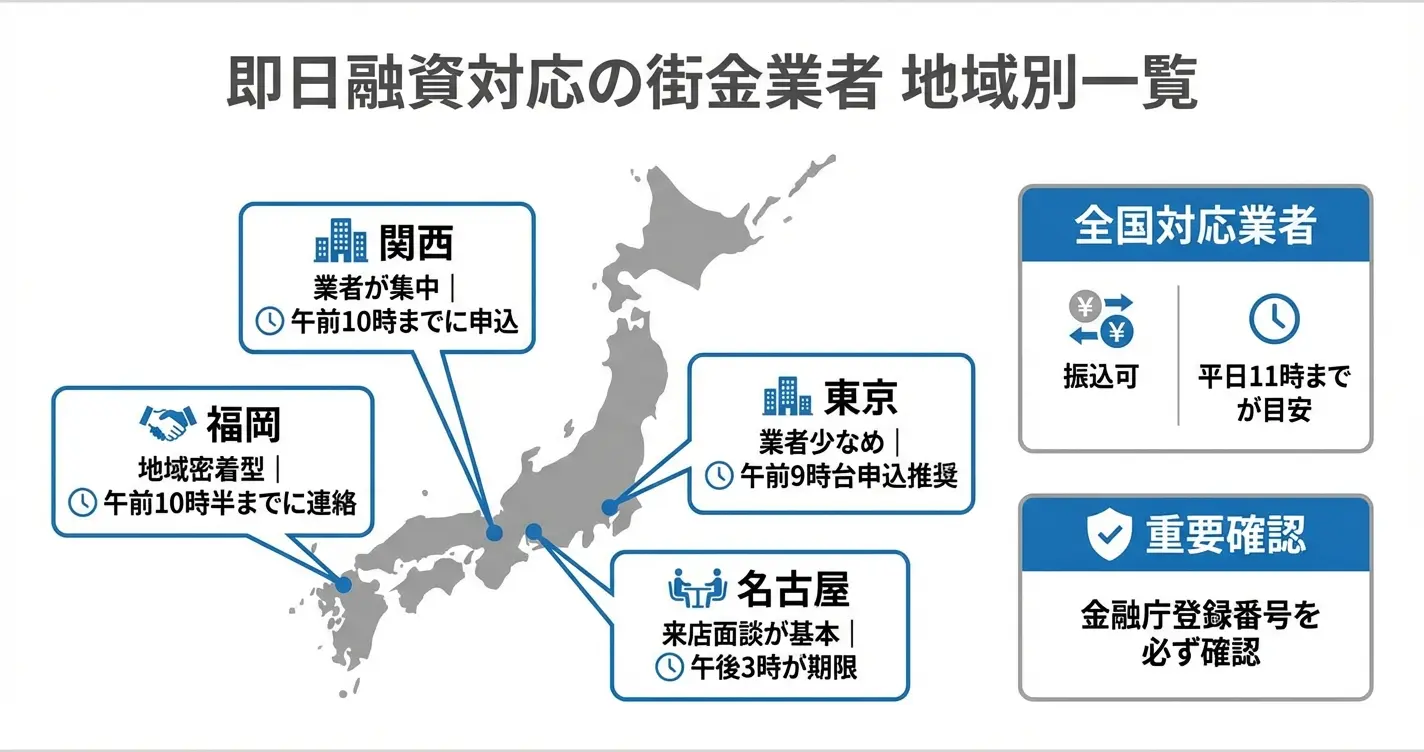 街金の即日融資は申込時間と条件を満たせば可能だが、業者によって対応範囲が異なる