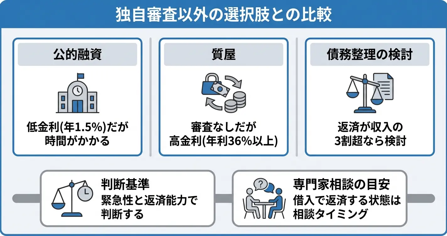 独自審査フリーローンは審査通過の可能性を広げる選択肢ですが、状況によっては他の方法がより適している場合があります。