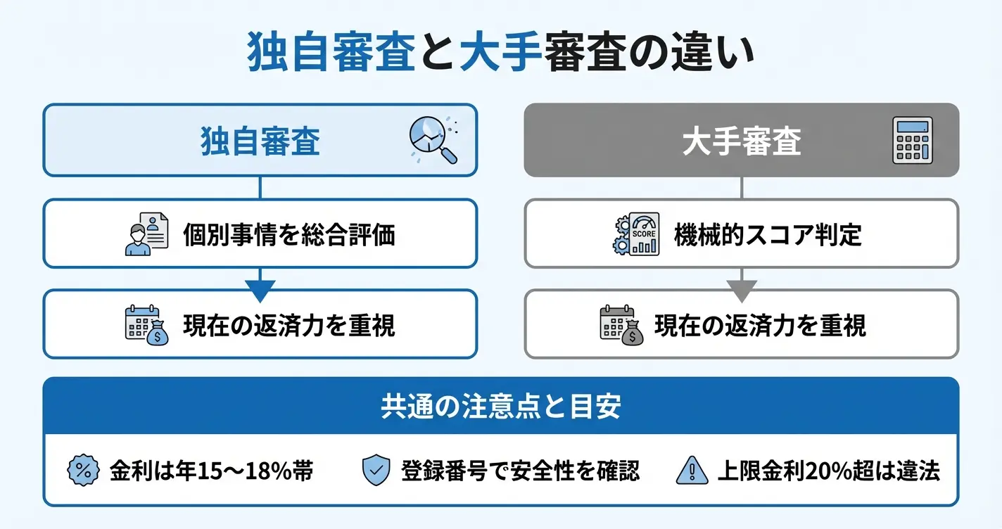 独自審査の「独自」とは、大手消費者金融のような自動スコアリングシステムだけに頼らず、申込者の個別事情を人の目で審査する体制を指します。
