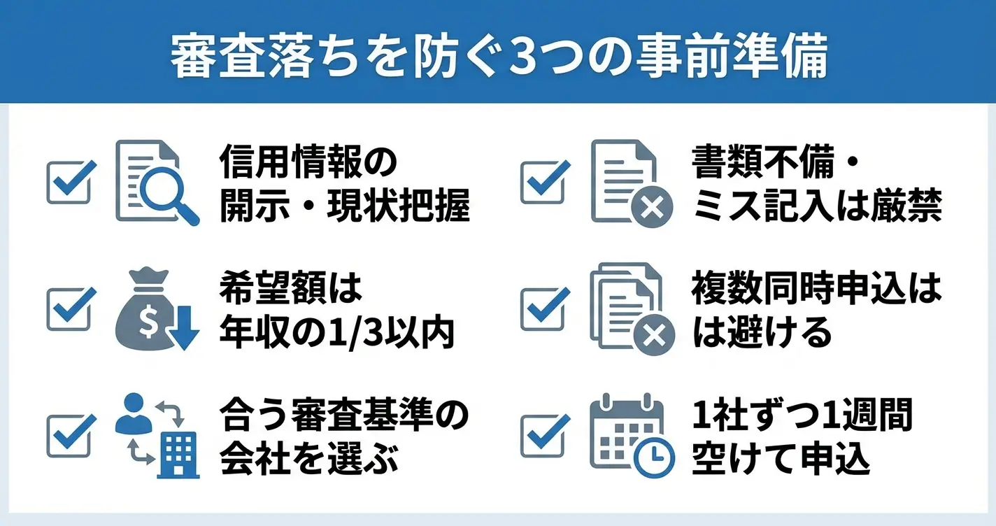 複数社への同時申し込みは信用情報機関に記録され、かえって審査に不利に働く可能性があります。まずは自分の状況に最も合う1社に申し込み、審査結果を待ってから次の行動を判断する方が審査落ちのリスクを抑えられます