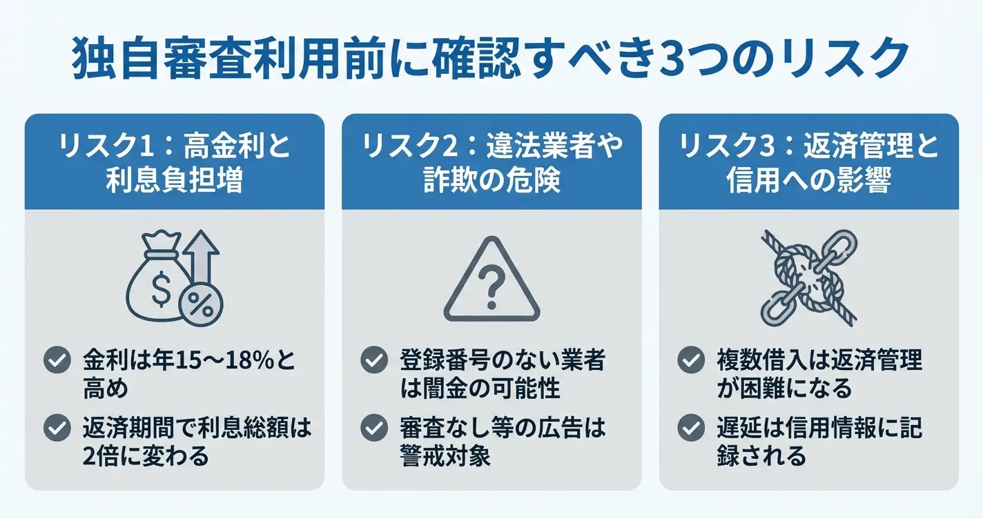 独自審査フリーローンで追加借入を行っても、根本的な返済能力の改善にはつながらず、多重債務の状態を深刻化させるリスクがあります。