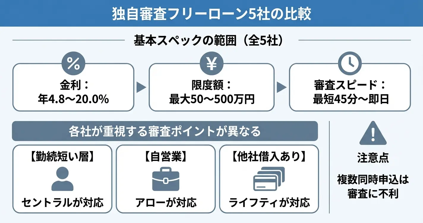 独自審査を行うフリーローン会社は、審査基準や金利設定、対応スピードがそれぞれ異なります。このセクションでは、主要5社の基本スペックと審査における強みを一覧で整理します。