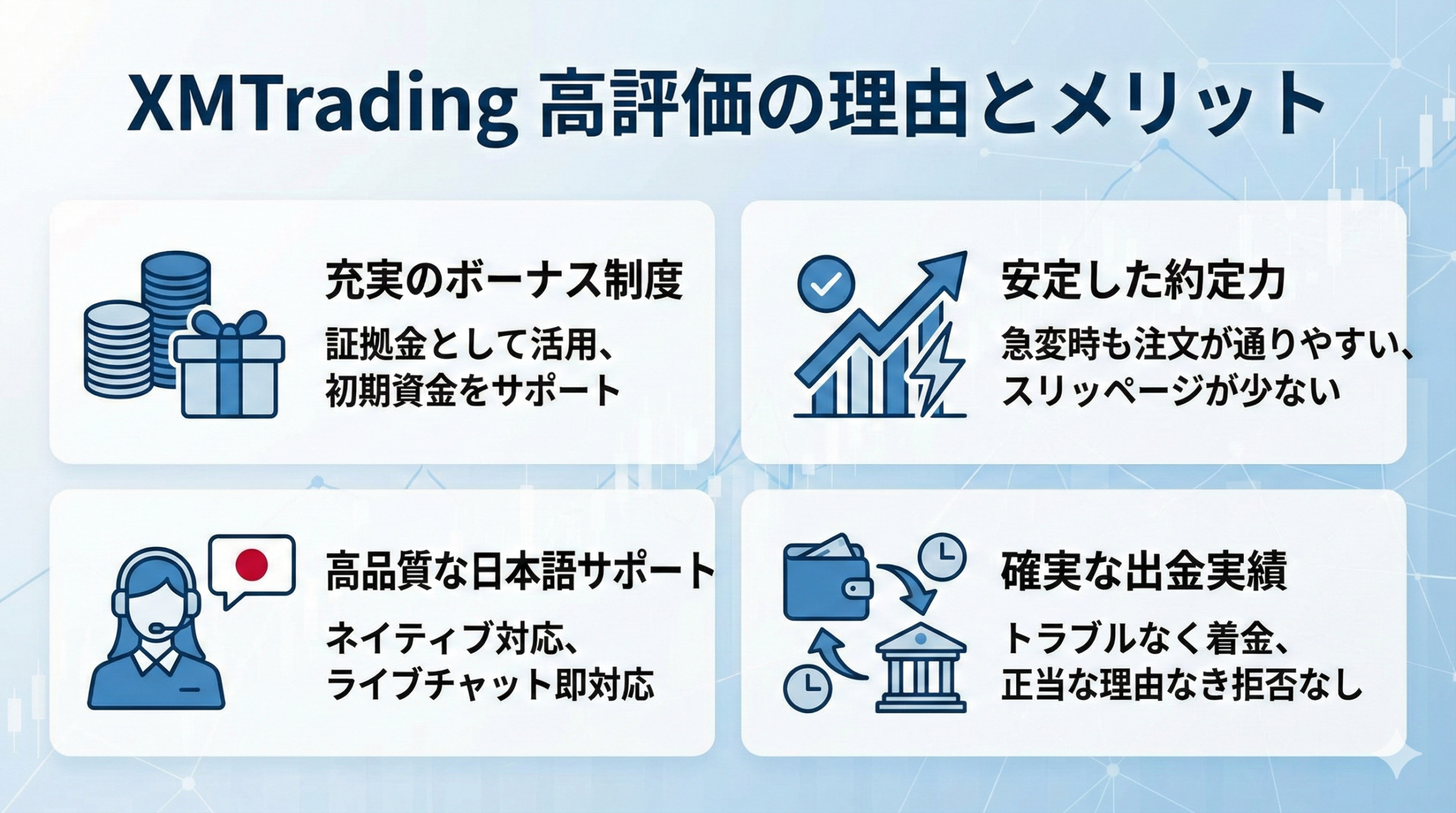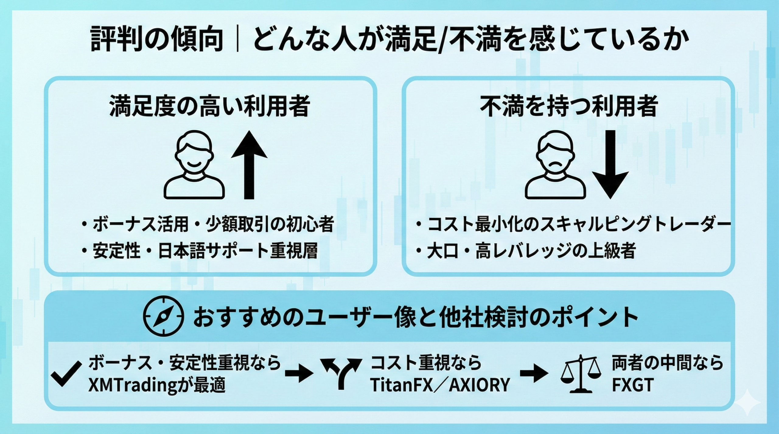 ボーナスを活用しながら少額から取引を始めたい初心者層、取引の安定性や日本語サポートを重視する層からは肯定的な評価が集まっています。