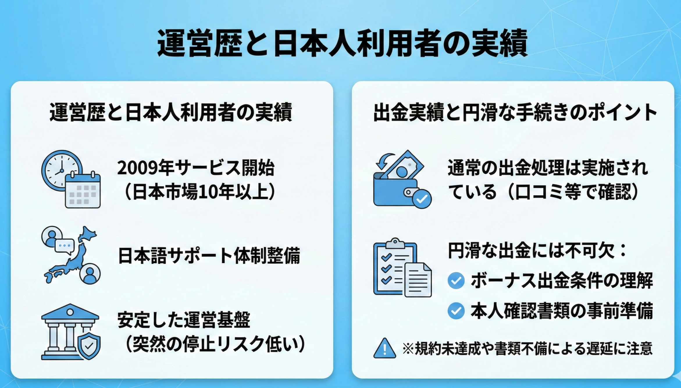ボーナス利用時の出金条件未達成や本人確認書類の不備による遅延事例も報告されているため、利用規約の理解と必要書類の事前準備が円滑な出金には不可欠です