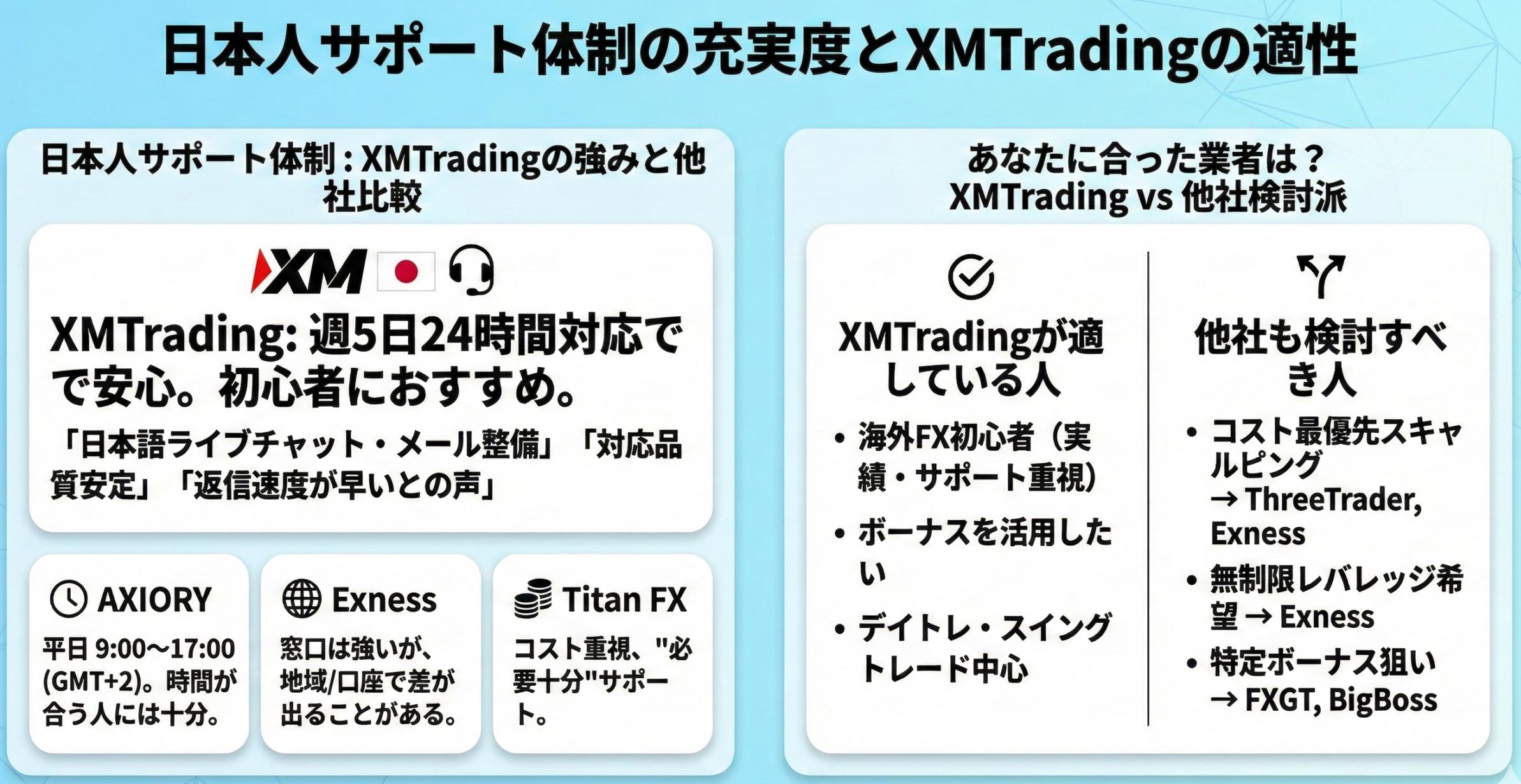 | XMTrading | “週5日24時間”の案内(ライブチャット/メール/電話) | “困ったらすぐ聞ける”を重視する初心者に強い |