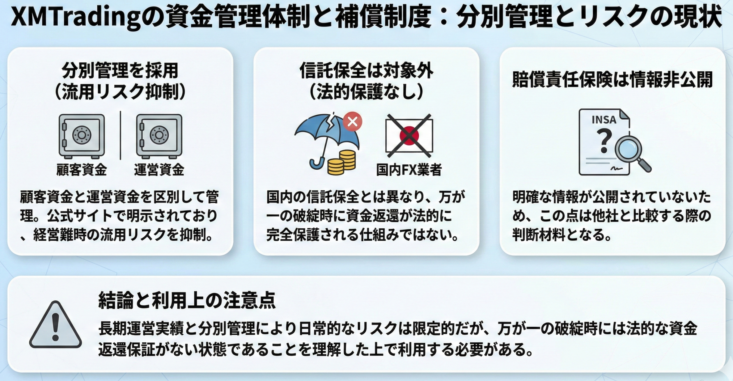 ただし、日本の金融商品取引業者に義務付けられている信託保全制度とは異なり、法的に完全保護される仕組みではない点には注意が必要です。