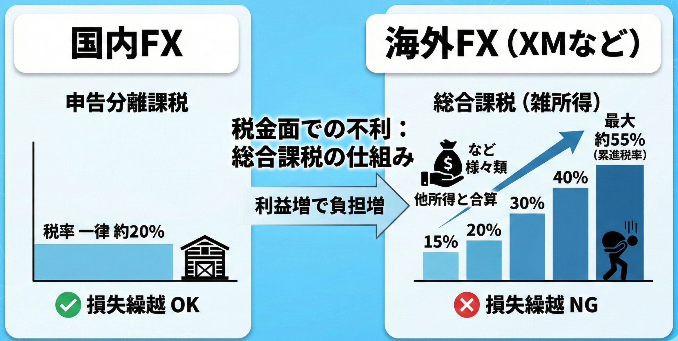 海外FX業者の利益は総合課税となり、累進課税が適用されるため、国内FX業者の申告分離課税と比較して税率が高くなるケースがあります。