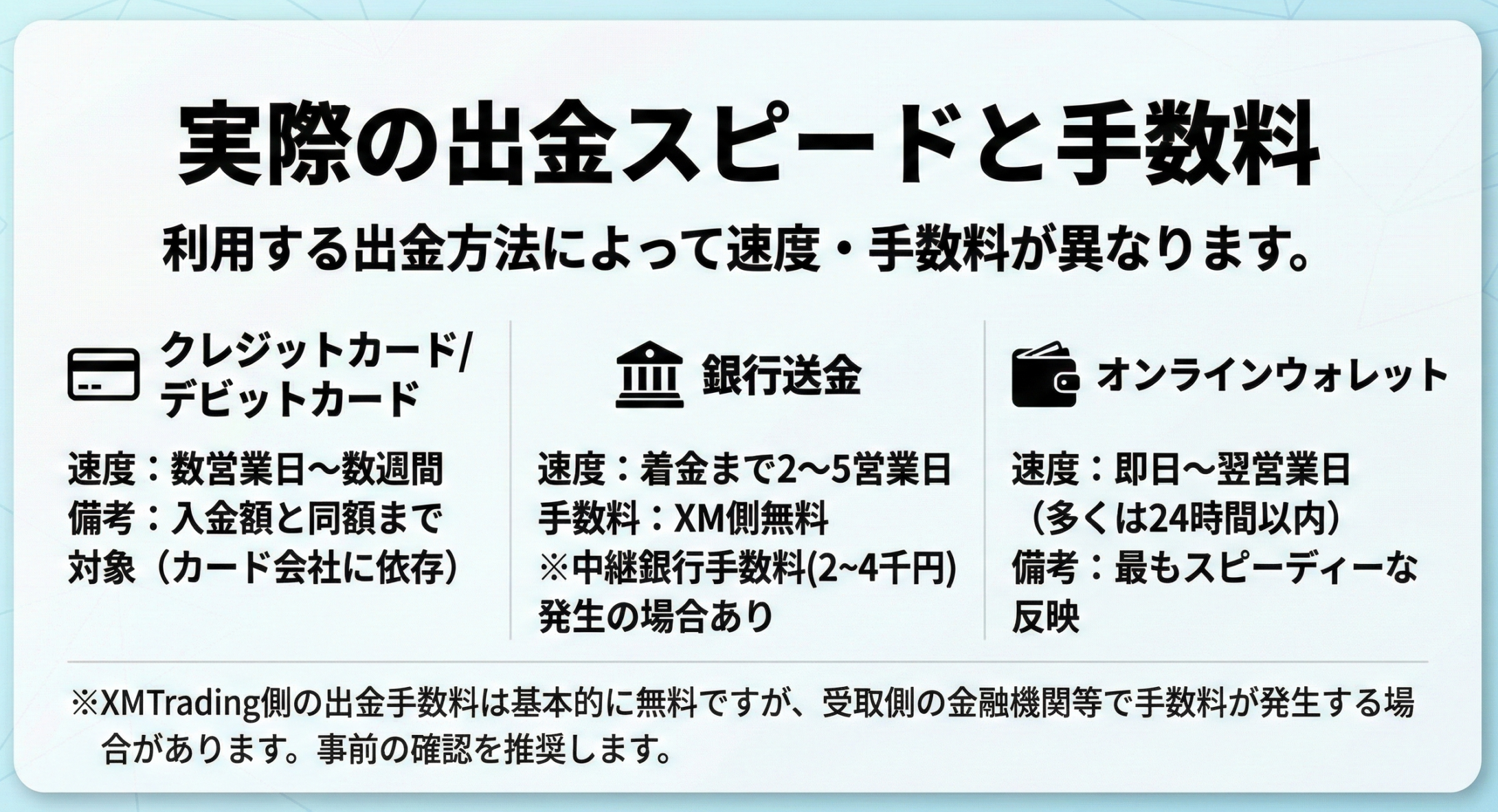 出金前に各手段の条件を確認しておくことで、想定外のコストや遅延を避けることができます。