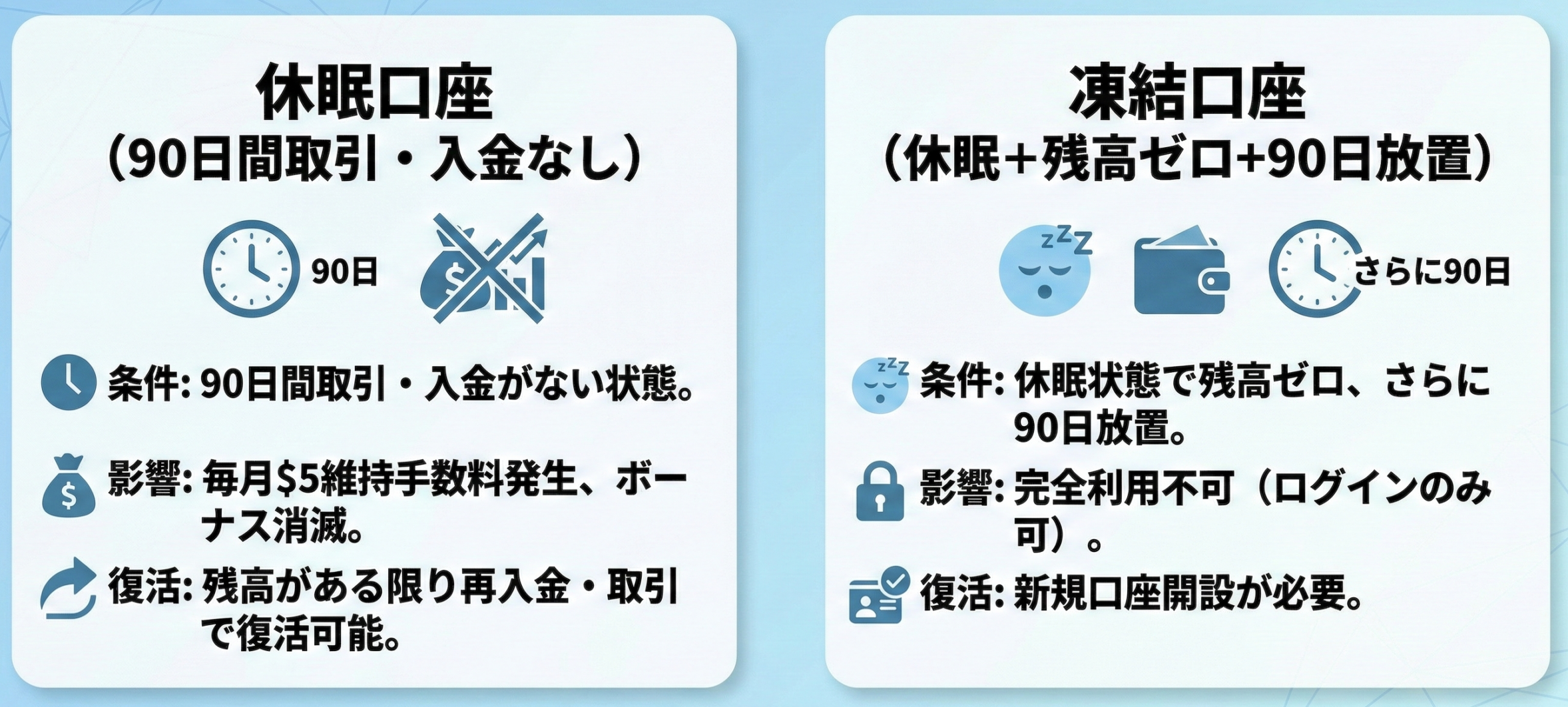 休眠状態になると、口座残高がある場合は毎月5ドルの口座維持手数料が引き落とされます。