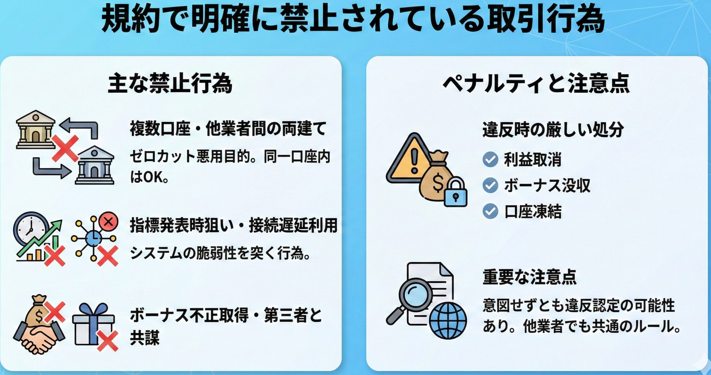 具体的には、複数口座間での両建て取引や、ボーナスの不正取得、自動売買ツールによる極端な高頻度取引などが該当します。