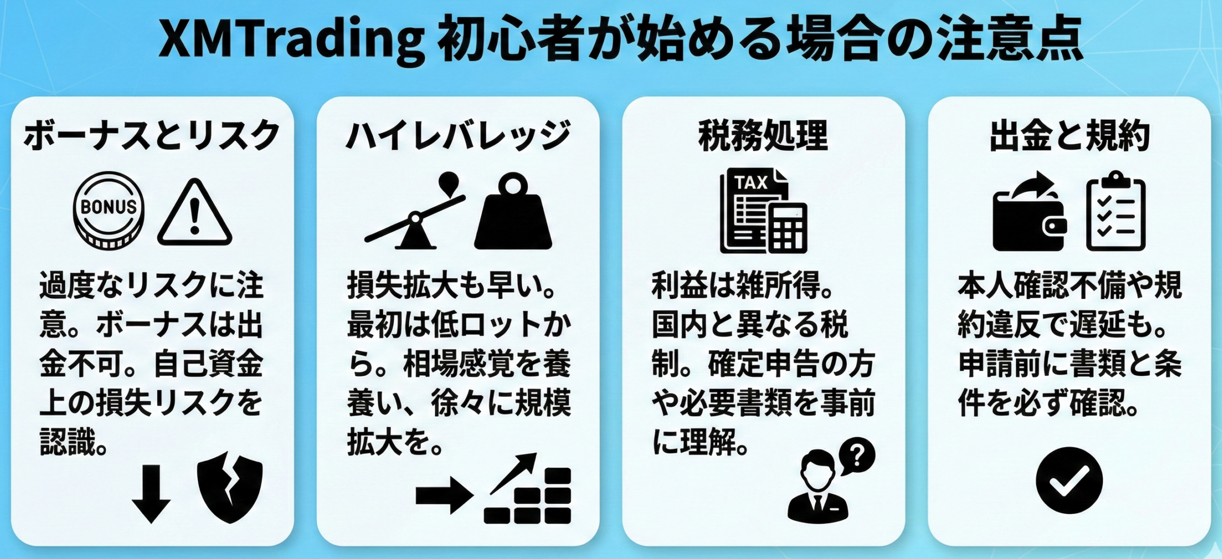初心者がXMで取引を始める際には、ボーナスの魅力に引かれて過度なリスクを取らないよう注意が必要です。