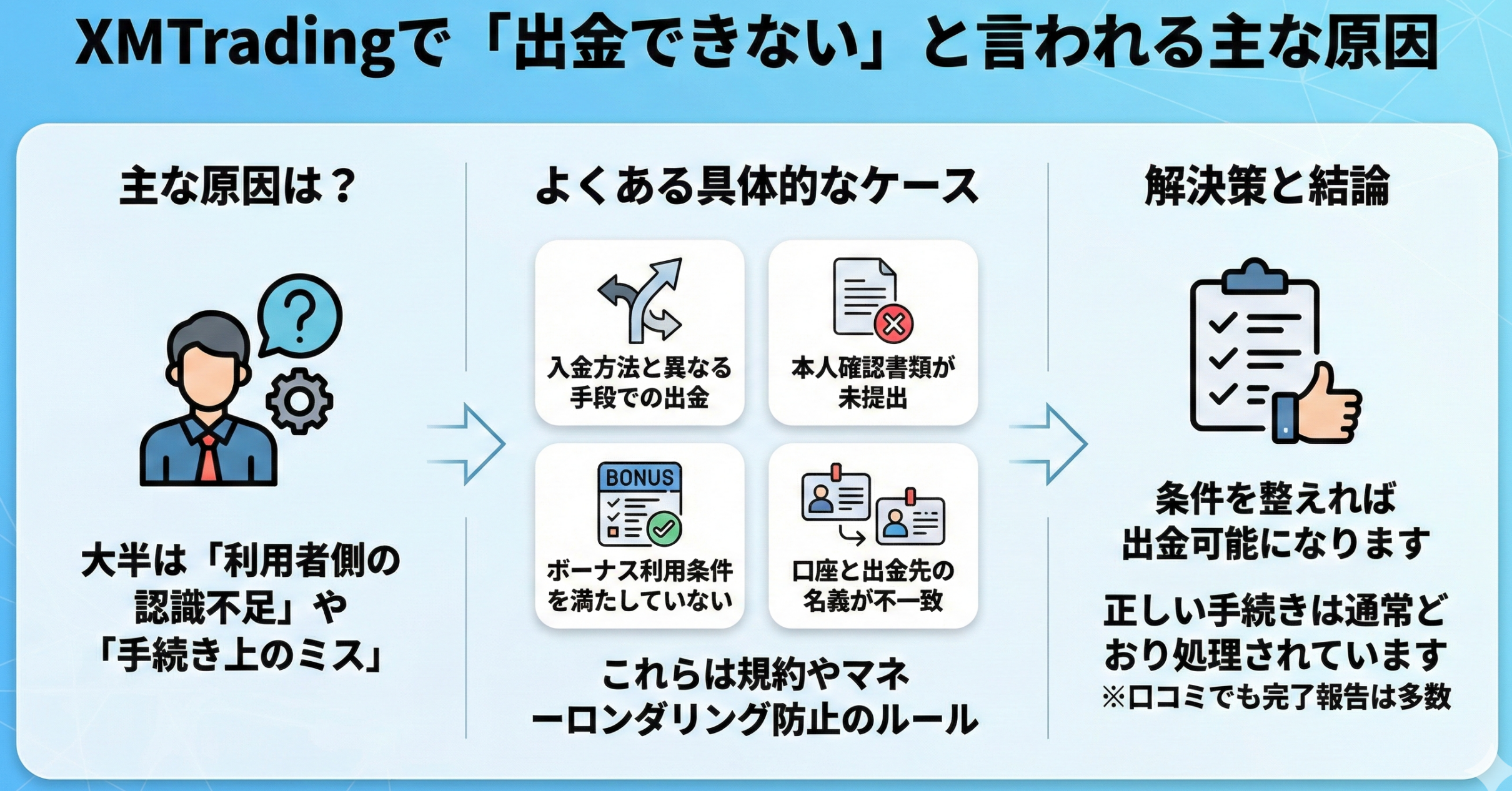 出金トラブルの多くは規約の理解不足や書類不備が原因であり、条件を整えれば出金可能になります