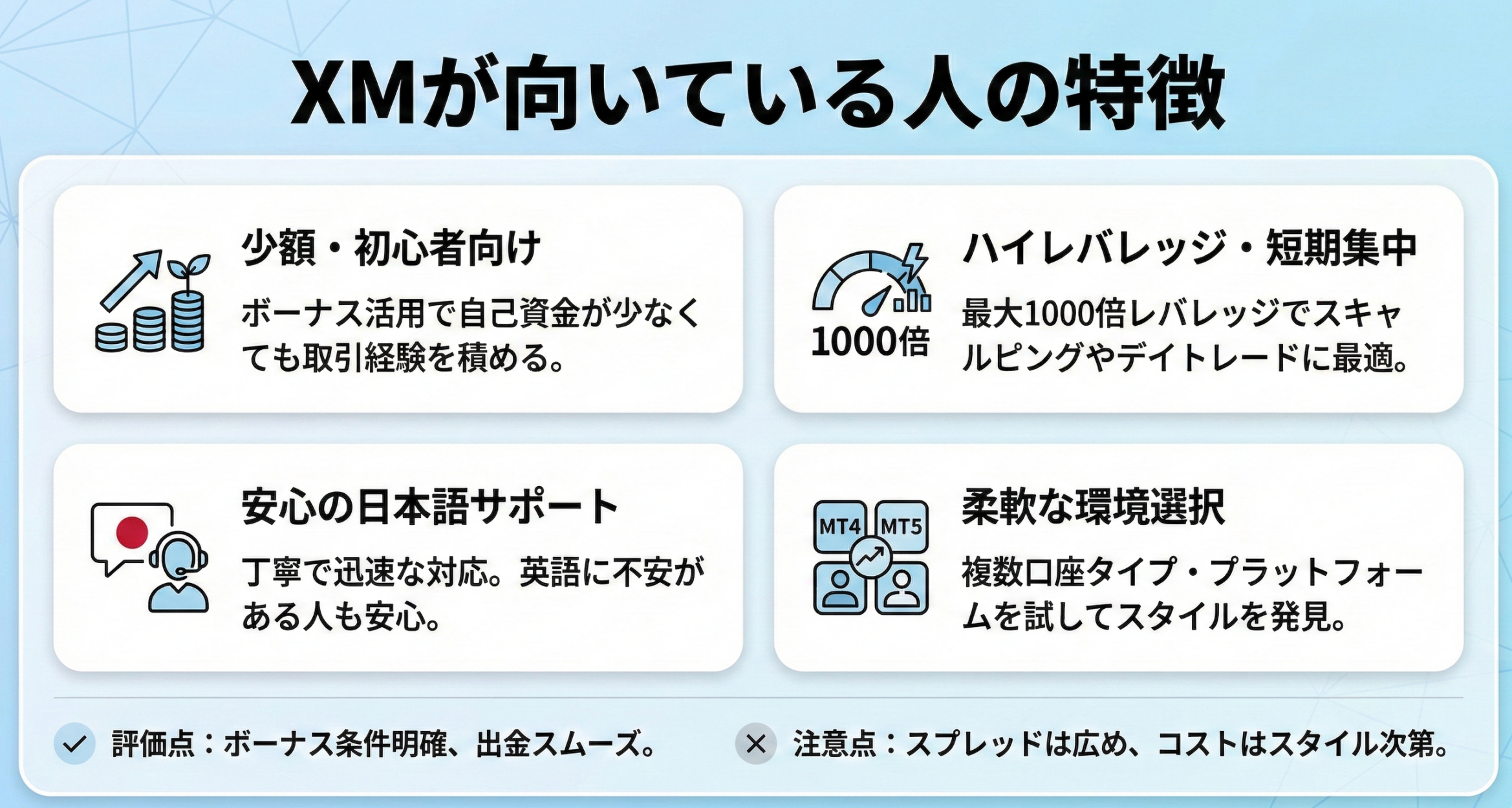 XMは少額から始めたい初心者や、ボーナスとハイレバレッジを活用して資金効率を高めたい人に適しています