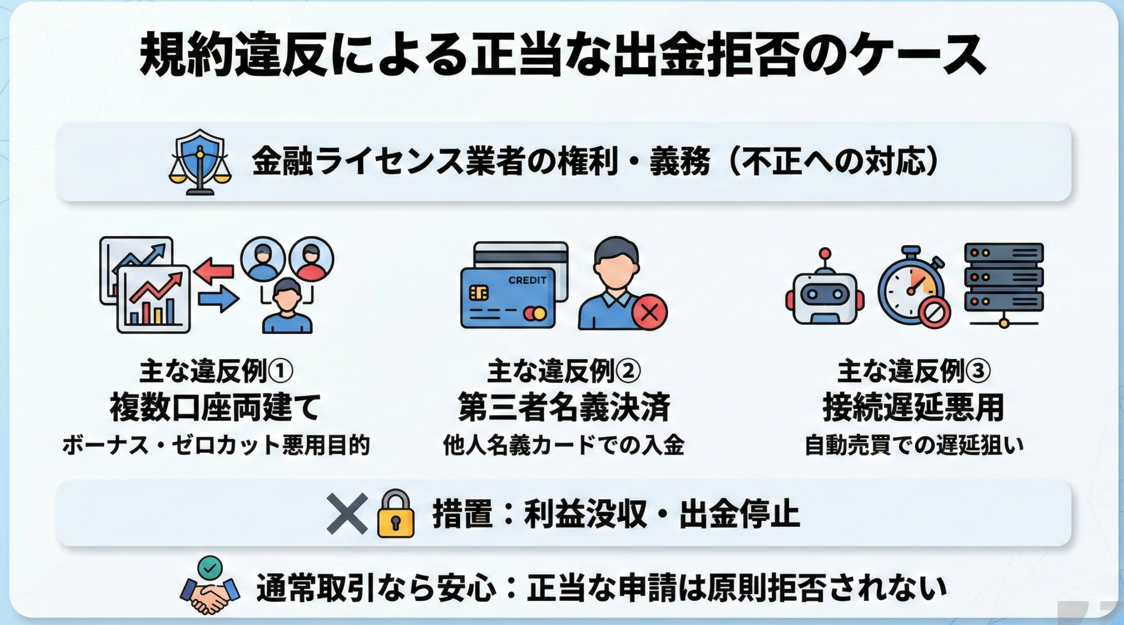正当な出金拒否と判断される主な違反行為としては、複数口座を利用した両建て取引、第三者名義のクレジットカードでの入金、自動売買ツールを用いた接続遅延の悪用などが該当します。